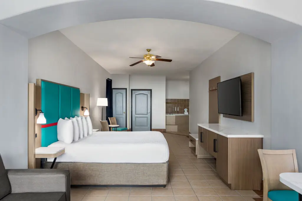 This room features one king bed, microfridge, microwave, 50″ TV, a sleeper sofa, and a jetted bath.