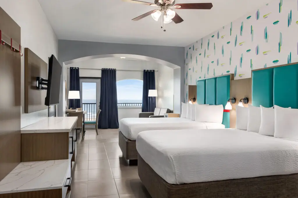 A spacious room facing the ocean with two queen beds, jetted bath, microwave, microfridge, 50″ TV, rollout table with dinning chairs, and a pull out